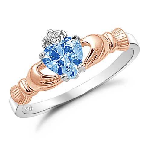 Sterling Silver Two, The claddagh is an Irish design that symbolizes love, loyalty, and friendship. Jewelry is crafted of high polished two tone-rosegold plated sterling silver and features a heart shaped aquamarine centerstone. A HEART SHAPED cubic zirconia dots the center of this claddagh ring and measures 9mm long x 2mm wide.